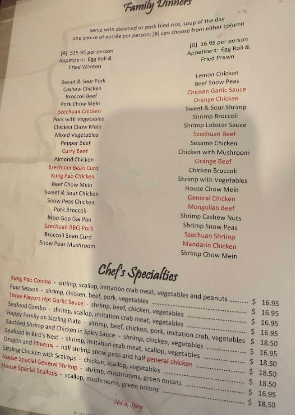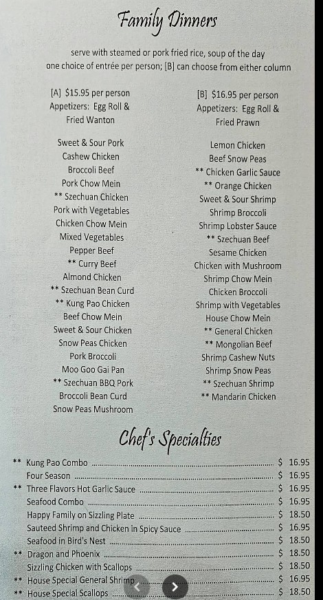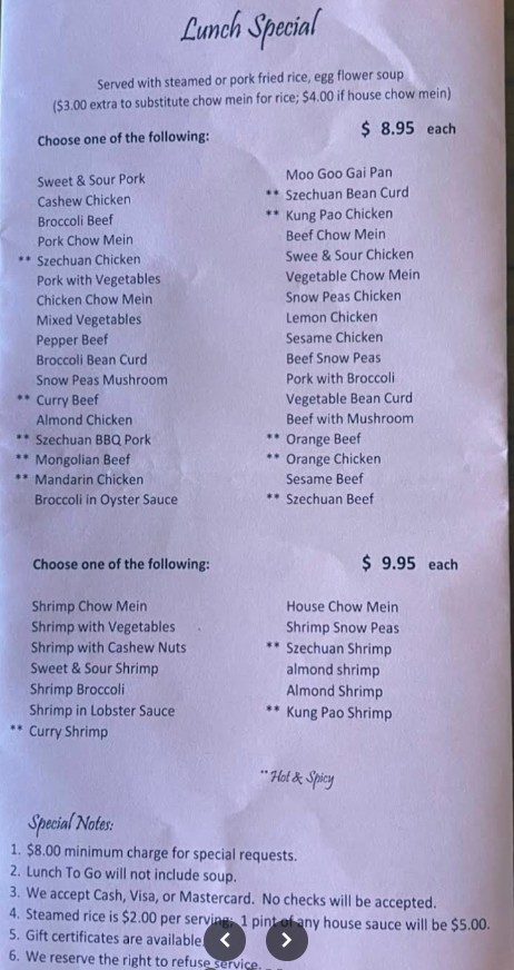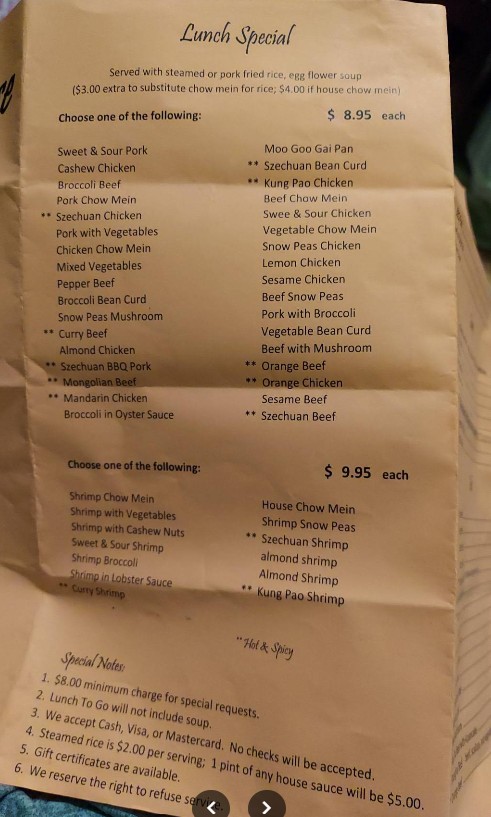 The staff was really friendly. However, I found the pricing for certain items confusing, and it wasn't clear if some options included sides. The Sizzling Chicken Soup had absolutely no flavor, but the egg rolls were hot and tasty. The chicken and broccoli were decent. I ordered my food to go and it came out quickly.